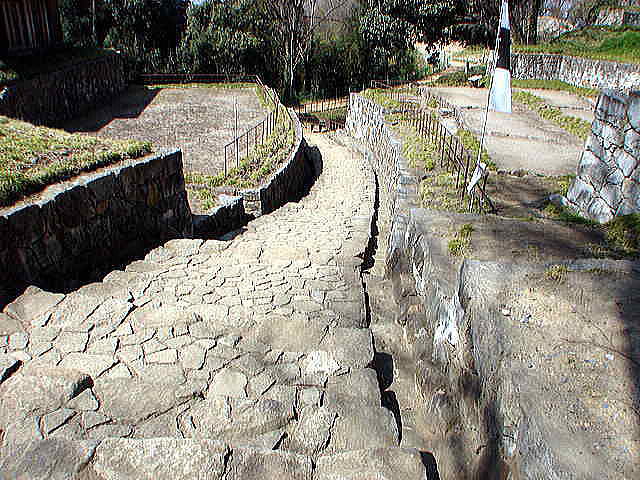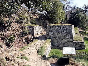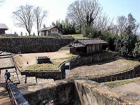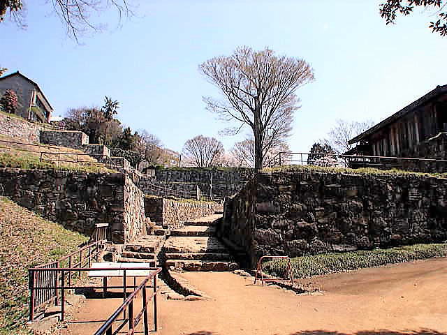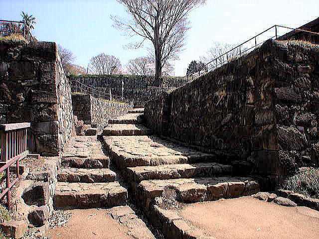 ![]() 関東地方の中世戦国城郭では、土手のように土で築く土塁がほとんどですが、金山城の土塁は石垣で造られているのが特徴です。 人の歩いている所が大手通路で、右の突き当たりが正面土塁です。後方の上の柵部分は三ノ丸。 |