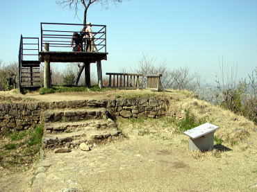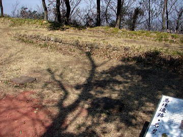 物見台(現地説明板より)物見台の基壇は、自然の地形に沿って等脚台形に造られており、 基壇中央から物見矢倉と考えられる柱穴が4本発見されている。 |