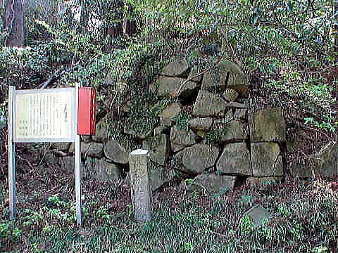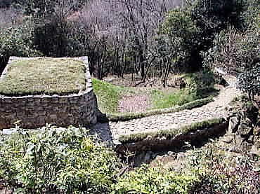 ![]() 物見台下虎口と土橋 通路の正面に石積みがあり、その先を見せないような工夫がされている。 |