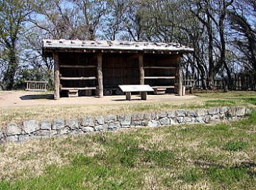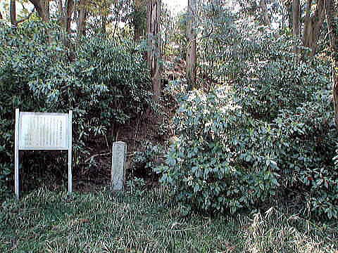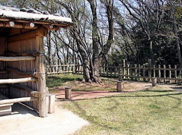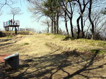 ![]() 矢倉台に残る4本の柱穴位置に遺構表示施設を造っているが、物見矢倉を復元したものではない。 |