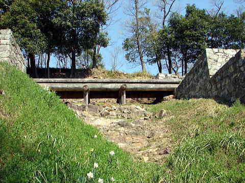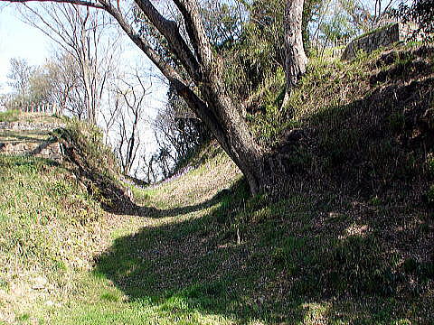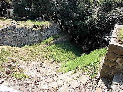 ![]() 竪堀 竪堀の脇には石垣があり、堀底には通路があった。 |