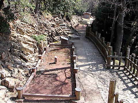 ![]() 馬場下通路の礎石建物址 岩盤斜面際の礎石石列は、発掘調査で確認された実物。柱間の木材は、補強のため整備上取り付けた。 |