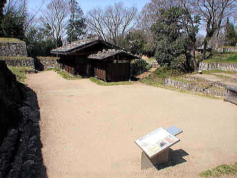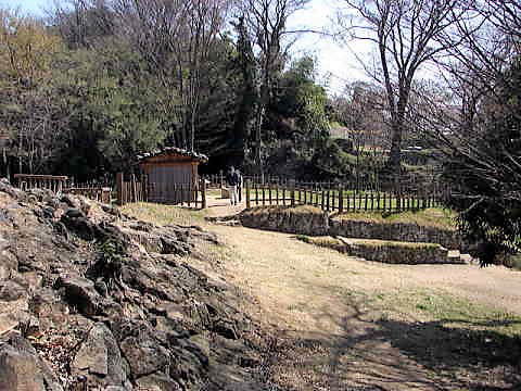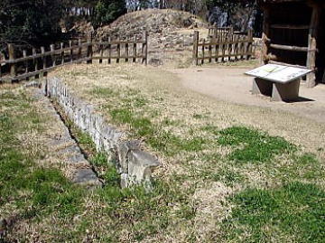 ![]() 馬場曲輪の四阿と手前は復元された排水路 |