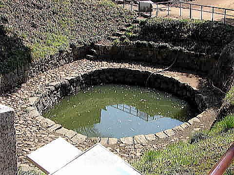 ![]() 月ノ池 調査の結果、月ノ池も日ノ池と同様に上下二段の石垣で囲まれた戦国時代の池だったことが明らかになった。城の中心部への入口脇にあり、訪れる者に水の豊富さを見せつける。 |