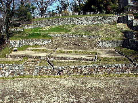 ![]() 三ノ丸から壇状に伸びた土塁石垣は、大手通路までせまっている。手前の石敷きされた通路が大手通路。 この土塁石垣では、調査の結果、5回にわたる改修の跡が見つかったため、石垣の一部は6回の構造の変遷を示す遺構としてそのままの姿で残している。右側の長方形をした石垣内下に展示されている。 |