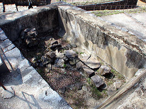 「石敷き遺構展示施設」内のカマド建物の東脇から見つかり、建物から火気を遠ざけていたと思われる。このことから、建物は火薬などを備蓄した「武器庫」を兼ねた「兵の詰め所」だったと考えられています。 |