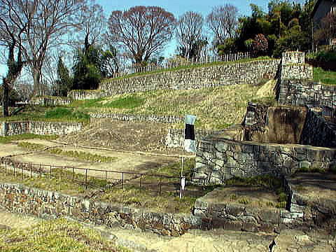 | 馬場通路と石塁 物見台から東の北側斜面際では、物見台基壇と一体となって造られた幅約1.2mの石塁が約72mの長さで発見された。この石塁は、北の長手口からの攻撃に備える防御上の効果があったと考えられている。さらに、長手口から、北側の岩盤を険しく見せるための視覚的効果を意識して、この石塁の上に築地塀が造られていたと考えられます。しかし、調査では上部の崩落が著しく、塀の痕跡は発見されなかった。 |