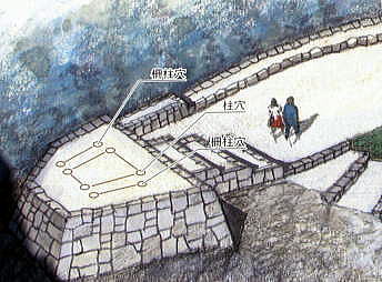 石敷きされた建物の基礎整備では、石敷きされた基礎の一部が見学できるように「遺構展示施設」として建物を造った。 |