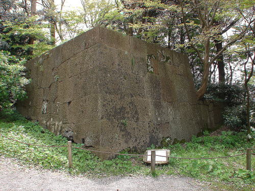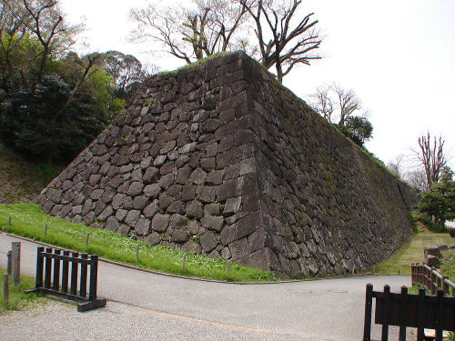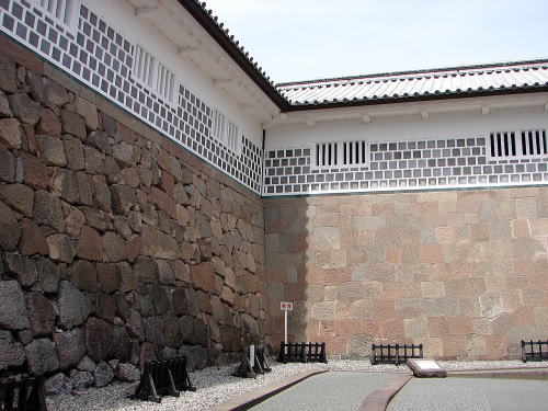 ![]() ▲「石川門」枡形内の石垣 枡形内の石垣は左と右で技法が異なり、左側が「粗加工石積み」、右側が「切石積み」で、ひとつづきの建物で違う積み方をしている。1765年(明和2年)の改修時の姿をとどめ、石垣上には多聞櫓をめぐらせる。 |