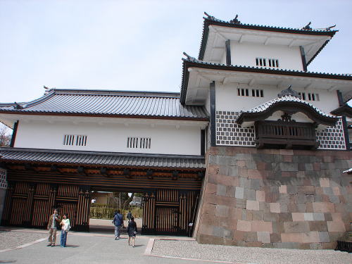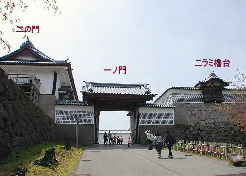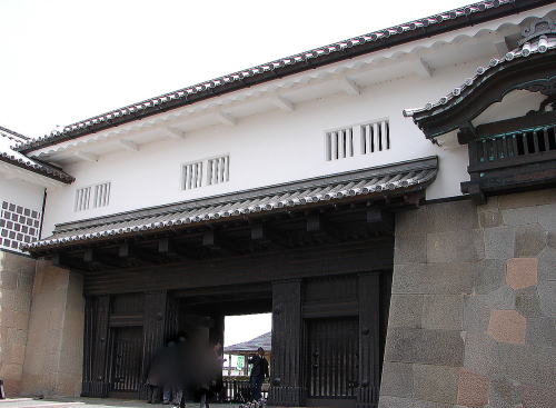 ![]() ▲河北門(かほくもん)〜一の門は、脇土塀を海鼠壁仕上げとし、ニラミ櫓台は、出し(出窓)付の土塀構造に復元。河北門は、金沢城の大手から入り、河北坂を上がったところに位置する「三の丸の正面」であり、金沢城の実質的な正門。現存する石川門と橋爪門と共に「金沢城三御門」と呼ばれている。 |