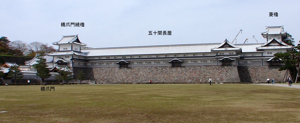 | 橋爪門続櫓(はしづめもんつづきやぐら)・五十間長屋(ごじっけんながや)・菱櫓(ひしやぐら) 橋爪門続櫓と菱櫓は3層の物見櫓。五十間長屋は、橋爪門と菱櫓を結ぶ2層の多聞櫓で、普段は倉庫として用いられるが、非常時は戦闘のための砦となり、石落としを各所に備え、格子窓は鉄砲狭間となる。 ![]() |