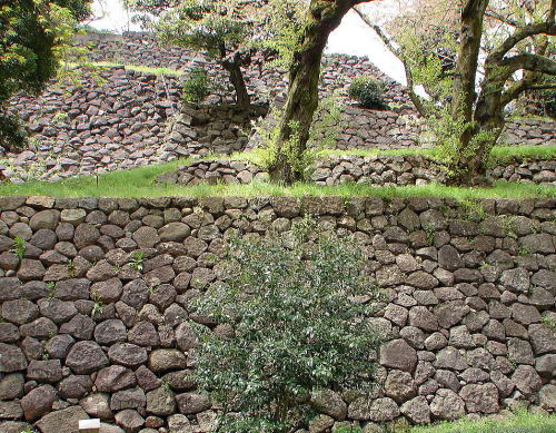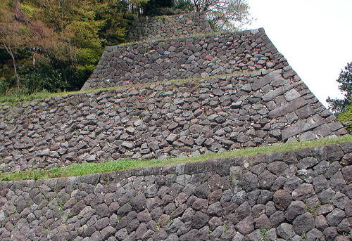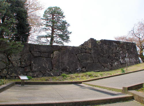 ![]() ▲本丸南面の高石垣 自然面を残す粗割石(あらわりいし)を積みあげた割石積み石垣。明治時代に上部が取り壊されて現状の姿になったが、もとの高さは約12間(約22m)以上ある城内随一の高石垣であった。 |