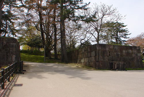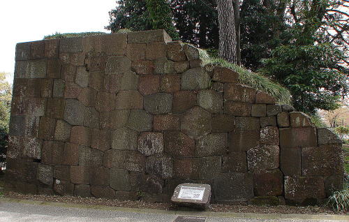 ![]() ▲大手門(尾坂門)石垣 巨大な割石を使った石垣。巨石は「鏡石」と呼ばれ、一般には城の正面によく用いられた。金沢城の石垣の中で最大の石もこのなかに組み込まれている。尾坂門が大手門だったことを示す一つの証拠と見られている。 |