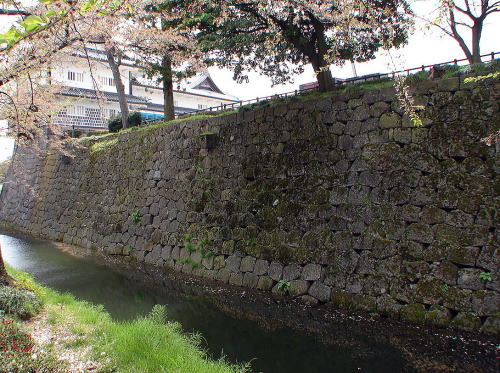 ![]() ▲いもり堀と鯉喉(りこう)櫓台〜金沢城復元整備計画に基づき往時の姿が甦ったいもり堀と鯉喉櫓台。いもり堀は金沢城の南西側を囲む外堀。南東端には鯉喉櫓台があった。後方は本丸跡。 |