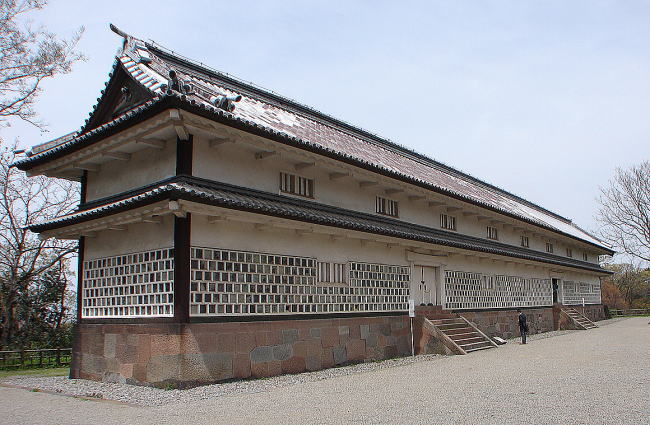 ■三十間長屋 金沢城本丸は、西と東北に付壇と呼ぶ小区画をつくり、東を東の丸と呼び、西側の付壇には三十間長屋が残る。三十間長屋は、2層2階の多聞櫓で、1858年(安政5年)に再建。倉庫として使われた。下層の外壁は、方形の平瓦を張りつなげ、目を漆喰で盛りあげた海鼠壁が特徴である。内部には、武器・武具が格納されていたと伝わる。三十間長屋の石垣の積み方は「切石積み」の技法で積まれているが、表面の縁取りだけをきれいにそろえ、内側を粗いままにしておく「金場取り残し積み」という技法が用いられている。 |