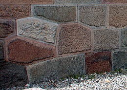 ![]() ▲鉄門石垣 「切石(きりいし)積み」の技法は、城の重要な部分に用いられ、本丸への入口となるここ鉄門の石垣にも、「切石積み」が見られる。石の表面を多角形に加工したすぐれたデザインで、丁寧なつくりになっている。 |