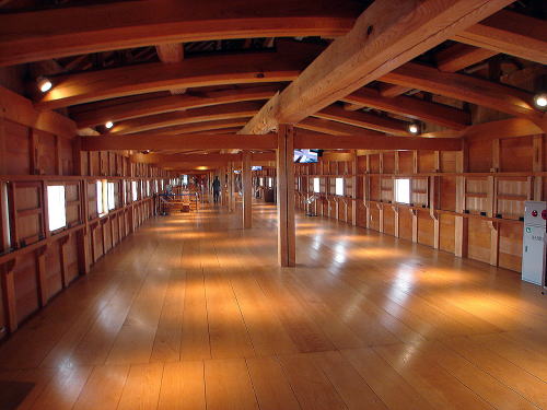 ![]() ▲五十間長屋内部〜日本に古くから伝わる木造軸組みの工法。柱・梁を組み合わせ、小屋を架ける。 |