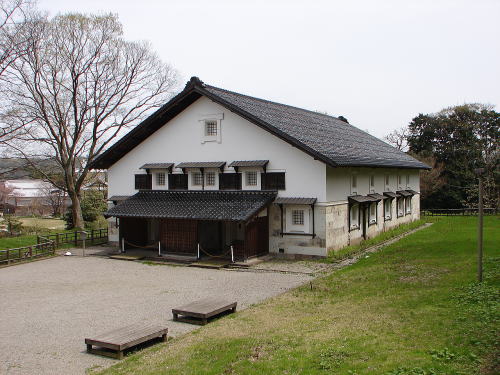 ■鶴丸倉庫![]() 本丸、東の丸付壇に残る武具土蔵 江戸時代前期は2棟並列してあったが、宝暦の大火(1759年)の後は1棟となり、幕末の1848年(嘉永元年)、現在のものに建て替えられた。明治以降は、陸軍によって被服庫として使われた。土蔵造り総2階建て、切妻造、桟瓦葺。 |
