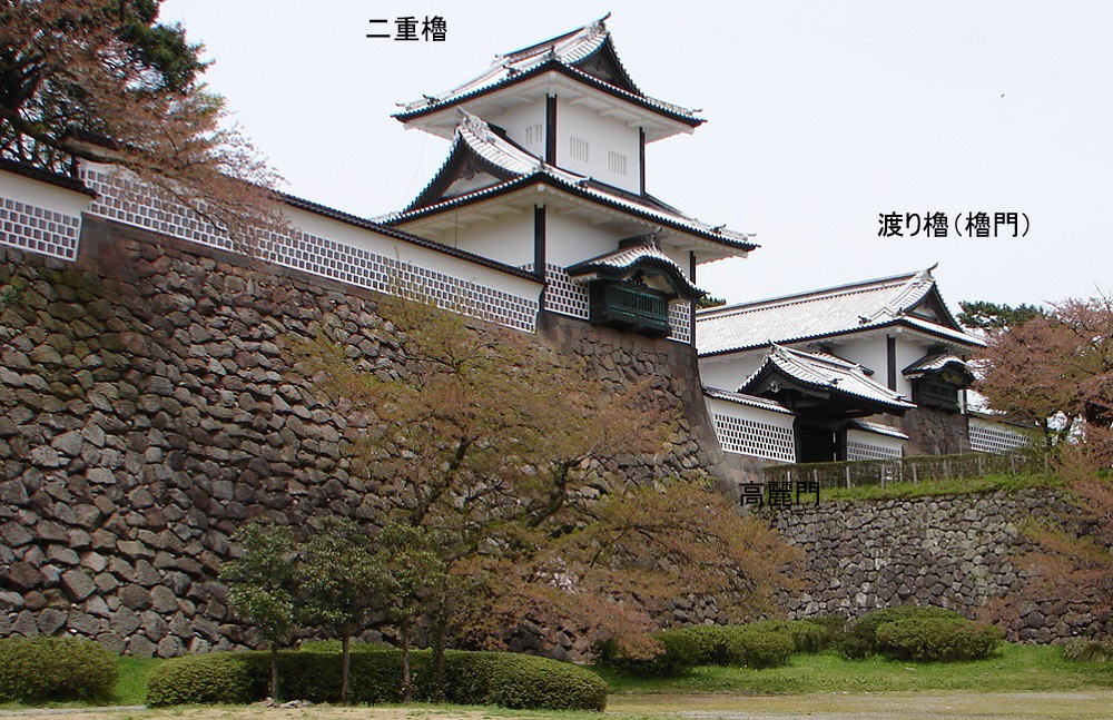 ![]() ▲河北門の「二の門(櫓門形式)」〜両側の石垣は、地元産出の戸室石を隙間なく積み上げる「切込接」 ※河北門の構成〜一の門、二の門、ニラミ櫓台及び枡形土塀により構成された枡形の空間で築かれている。石川門も同様の構成。 |