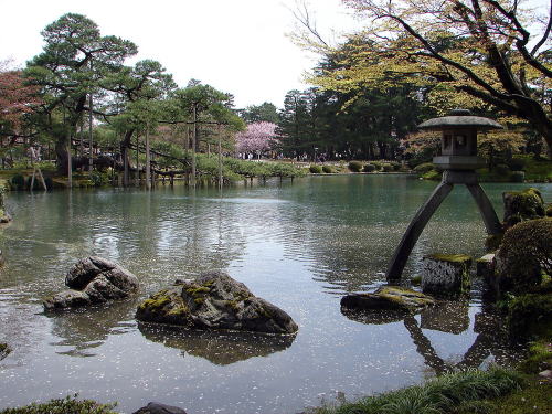 ![]() 徽軫(ことじ)灯籠〜霞ヶ池のほとりにたつ兼六園の象徴。二股に分かれた足が琴柱(ことじ)を思わせることからその名がある。 |