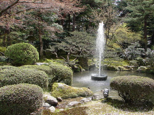 ![]() 噴水〜霞ヶ池を水源としており自然の水圧であがっている。日本最古といわれている噴水。 |