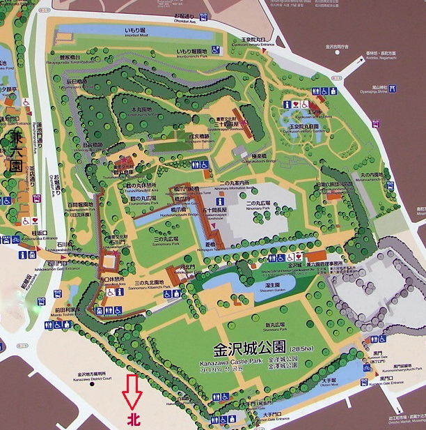 ![]() ▲本丸 古くは金沢御堂があった場所と伝え、天正11年(1583)の賤ヶ岳合戦後、前田利家が入城し、天正14年(1586)頃に天守閣を設けたといわれる。天守閣は慶長7年(1602)に焼失し、代わって3階櫓が建てられた。寛永の大火(1631)までは本丸に御殿がおかれ、金沢城の中心であったが、大火後は二の丸に移った。 |