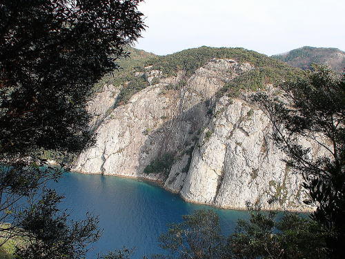 ![]() 黒瀬湾入口に見える石英斑岩の絶壁「鋸割岩(のこわきいわ)」 |