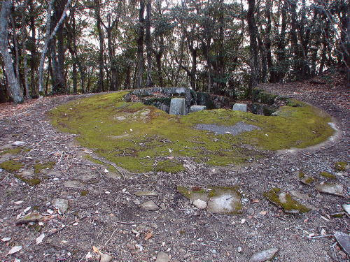 ![]() 掘立柱建物跡(上段) 地山を階段状に整地して平場を造り、柱穴(8個)は岩盤を円形に掘り込んでいた。建物の内部と周辺から須恵器、土師器が数百点出土しており、いずれも7世紀後半の遺物である。この地は城の南端に位置し、東部に黒瀬湾を見渡せ、南門にも近いから、この建物の用途としては防備兵の詰め所や見張り場のほか、南門守備の役割も考えられる(案内板より)。 |