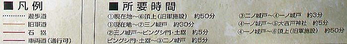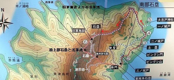 ※次は、大吉戸神社から遊歩道に戻り、矢印の方向(北・西ルート)に向かい、旧軍施設まで進み、南西部石塁、東屋、南門を経由して蔵ノ内に戻ってきました。大吉戸神社から旧軍施設間の北・西ルートは、登り降りのきつい道が続きますが、途中、鋸割岩や石垣が見られます。 (図は案内板に追記、転載)。 |
