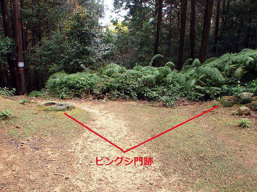 ![]() ビングシ門跡 両端の門礎石のうち、左はレプリカ。左奥に進むと二ノ城戸です。 |