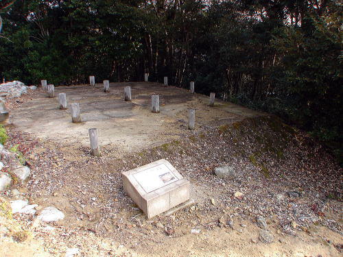 ![]() 掘立柱建物跡(下段) こちらの建物も建設にさきだって地山を階段状に整地した狭い平場に建てられている。上段の建物跡に比較するとやや小ぶりである。建物内部と周辺から7世紀後半の須恵器、土師器が出土しているが、その数も少なく倉庫等の可能性が高いと考えられる(案内板より)。 |