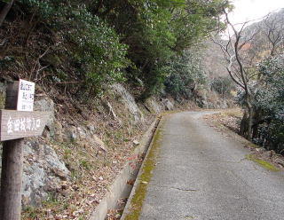 | (左)城戸。県道24号線から現在地(蔵ノ内)に向かう道に入った所。道幅はおよそ車1台分です。(中)上の金田城跡図の現在地です(@蔵ノ内・駐車場約5台)。(右)登山道入口(蔵ノ内)。ここから徒歩。まずは東南角石塁を目指します。 |