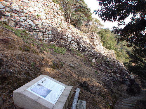 ![]() 東南角石塁下の説明板 次は、写真右下の遊歩道を右奥へ戻り、三ノ城戸に向かいます。右の写真は、右奥の石積部分となります。 |