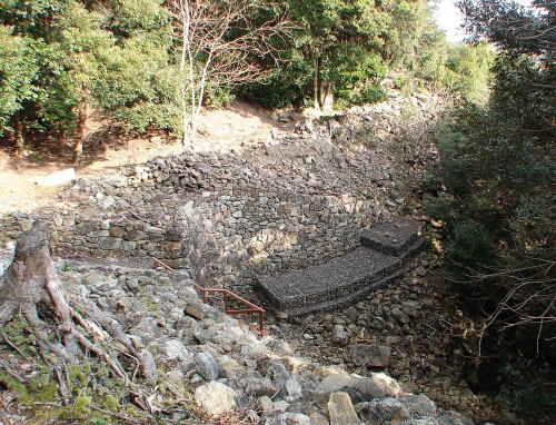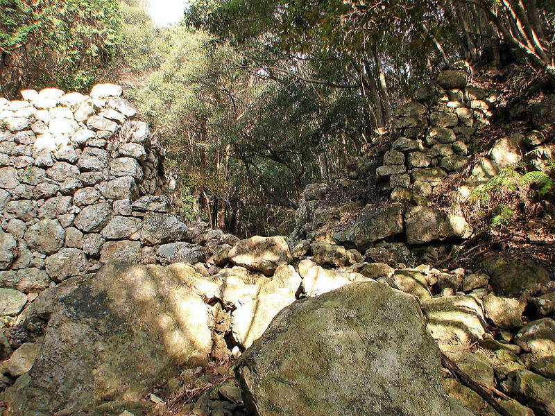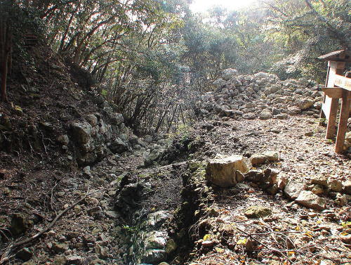 ![]() 三ノ城戸跡(外部側) 三ノ城戸は、上流からの流水により破壊されているが、残された石垣は7m近く積まれている。 |
