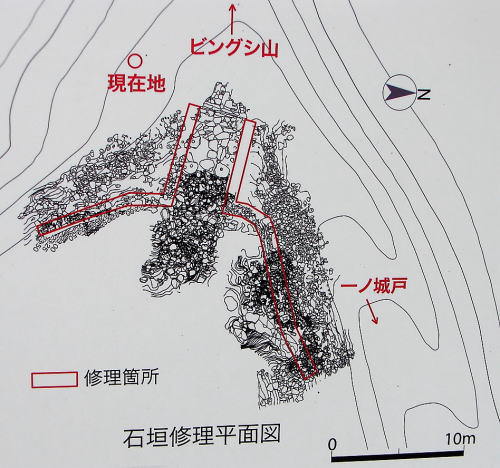 ![]() 石垣修理平面図(案内板より) 城門両側の石垣は上半部が崩落して、多くの石材が流出していた。そのため、平成16年度〜平成18年度まで門にとりつく両側の石垣と門跡の側壁の整備をおこなった。 |