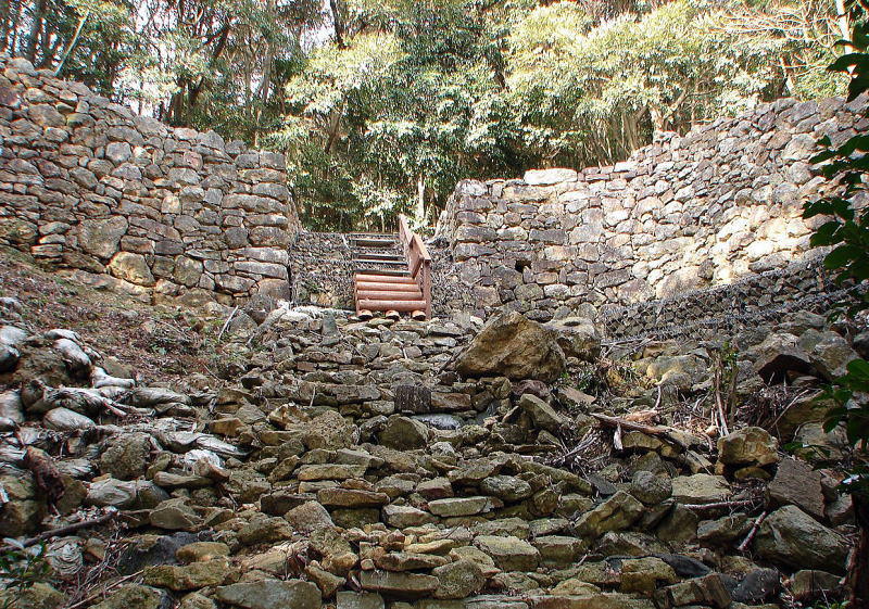 ![]() 海側から見た二ノ城戸城門跡(城門入口側) 城門は正面の間口1間(約3m)、奥行3間(約5m)の規模と推定され、城門両側の 石垣は海側から見た高さが5m以上あり、築城当時は威容を誇っていたと想われる。 |