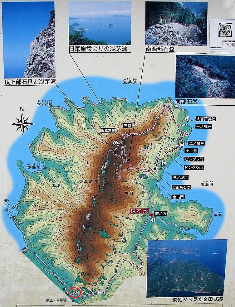 金田城跡図(案内板より転載) ![]() ![]() <県道24号線・城山入口(城戸○)から現在地(登山口・蔵ノ内)間(約1.8q)は一部未舗装で悪路のため、運転に注意> |