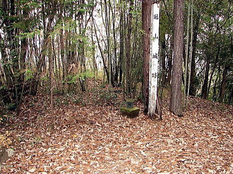 ![]() 冠山城登城口 突き当たりの樹木部分が城跡。 |