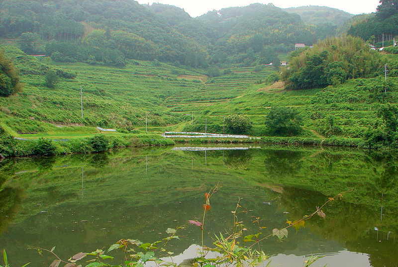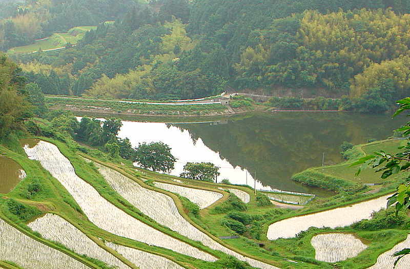 ▲「北庄の棚田(日本棚田百選)」から見下ろす「神之淵池」