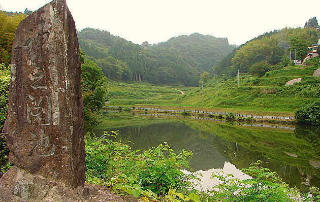 この池は、大正13年(1924)の大旱魃(かんばつ)を契機として、地域の農民が結束して立ち上がり、昭和3年の完成まで、5年の歳月を費やして築造したため池である。要した労役延べ50万人、工費百万円(現在の貨幣価値換算約3億5千万円)底樋(そこひ)48メートル、縦樋(たてひ)19メートル、水深15メートル、貯水量約11万立方メートル。灌漑(かんがい)面積約40ヘクタール。土木機械というものが全くなかったその時代に、組合員が一丸となり、黙々と毎日10時間の重労働に従った。千本突きと杵(きね)突きにより、3センチの鋼土が1センチ以下になるまで突き固め、コンクリート以上の硬度にするという、気の遠くなるような作業の積み重ねによって、高さ22メートル、延長128メートルの堰堤(えんてい)を築き、80年を経た今日に於いても危険を感じる水漏れは全く生じていない。 正に人間の「汗と脂と精神力」によって成し遂げた偉業を、目のあたりにする思いである。後年、岡山県知事萱場軍蔵は、この事業を「人間業の極致」と讃え、昭和天皇は侍従をご差遣(さけん)になってお言葉を賜わった。この池の完成により、新しい周囲21ヘクタールが生まれ、地域の農家一戸当たりの耕作面積は倍増し、単位面積当たりの米の生産量と、貯蓄高が県下一と謳われるまでになったのである。海抜526メートルの笛吹山(ふえふきやま)より受け、翠を湛えたこの水は、蜘蛛の巣のように張り巡らされた水路と、サイホンと、隧道(ずいどう)を経て、起伏つねならぬ急傾斜地帯の水田の、隅々にまで届けられ、史蹟誕生寺を囲む疏水となり、岡山市に至るまでの灌漑に余慶(よけい)を与え、上水道の水源ともなって、人々の生活と心を潤し続けているのである。 平成22年5月 久米南町・神之淵池用水組合 (現地説明板より) |