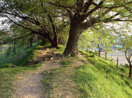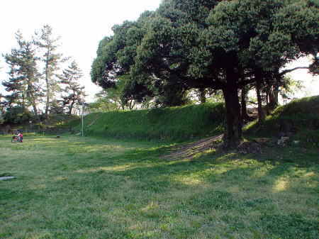 ![]() 土塁の上部 左側は本丸内、右側は堀跡。 |
