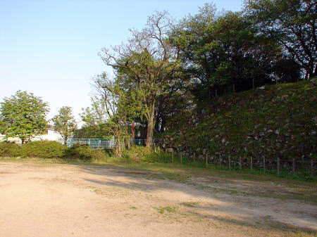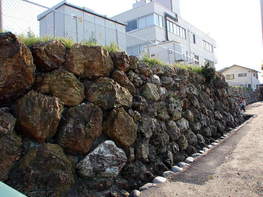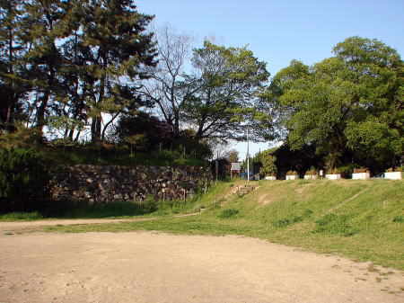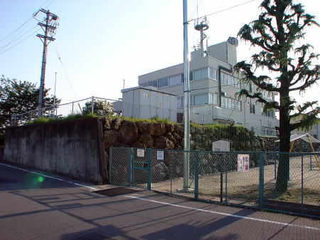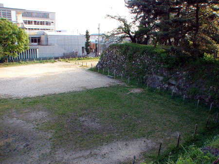 ![]() 二之丸北側の現存する石垣 この場所(平地・小学校グランド)は二之丸と三之丸を隔てる堀にあたり、幅は23〜4mもあり、隣の荒田川から水を引いていた。 |