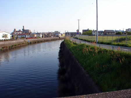 ![]() 荒田川 城北橋からの眺めで、川の右側の平坦地も二之丸跡となる。 |