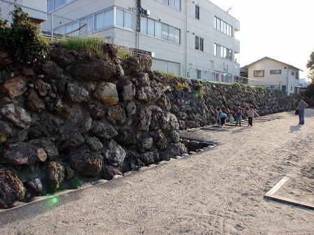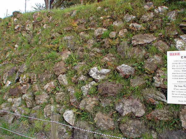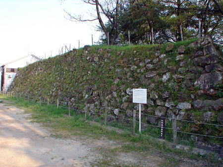 ![]() 本丸北側の石垣 北門に向って左側(東)部分の石垣。石垣の前は、当時は堀であった。 |