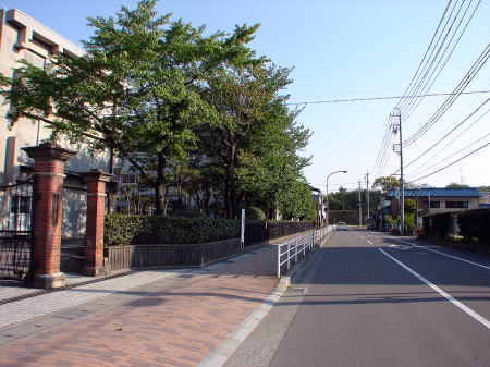 ![]() 左側は、三之丸跡に建つ加納小学校、右側一帯は厩曲輪跡。突き当たりが加納城跡。 |