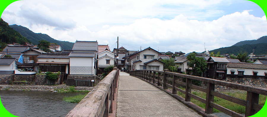 旭川に架かる中橋から望む勝山町並み保存地区と高瀬舟発着場跡 ここは、かつて高瀬舟の最上流の船着き場であった。昔、産物の輸送は、すべて川を利用しており勝山より岡山まで地方の産物を積み、勝山への帰りは、塩・日用雑貨品を積んで運んでいた。旭川では勝山が最上流の船着場で、中世から近世にかけての繁栄を支えていた