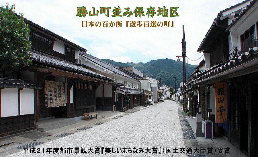城下町 勝山 古くは勝山藩二万三千石の城下町であり、出雲街道の宿場町として栄えた勝山。白壁や格子窓の商家や民家、なまこ壁の土蔵といった伝統的な建造物が並び、城下町のたたずまいを残す古い町並みは、昭和60年に県下で初めて指定された「町並み保存地区」