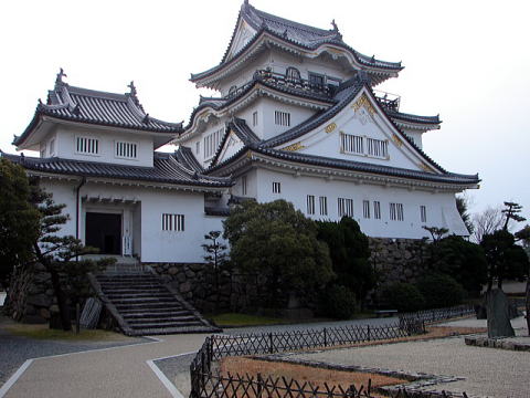 | ■岸和田城がいつ、誰が建てたのか定かではないが、建武元年(1334年)頃、楠正成の一族和田高家が、当時「岸」と呼ばれていたこの地に城を築き、根拠地としたことから「岸の和田氏」と呼ばれ、「岸和田」の地名の起こりになったといわれている。戦国時代末期(16世紀中頃)には、当時泉州地方を治めた松浦氏の居城として現れる。 ■織田信長の家臣津田信張・蜂屋頼隆がしばらく在城した後、羽柴秀吉は天下統一の過程で紀州の根来寺などの勢力への押さえとして、子飼いの家臣である中村一氏を城主とし、根来寺壊滅後は秀吉の叔父にあたる小出秀政を城主として、城や城下町の整備にあたらせた。天守は秀政によって築かれ、慶長2年(1597年)に完成。 ■豊臣氏滅亡後、松平(松井)氏2代を経て、寛永17年(1640年)、摂津高槻から岡部宣勝が入城し、以後、明治維新まで岡部氏が13代にわたって岸和田藩5万3千石を治める。江戸時代の岸和田城は、大坂の南の守りとして、幕府の西国支配に重要な役割を果たした。 ■この間、文政10年(1827年)、落雷によって5層の天守は焼失し、以後長らく再建されなかったが、昭和29年(1954年)、鉄筋コンクリート造りで3層の天守が再建され、また昭和44年(1969年)に城壁・城門・隅櫓が再建された。 |