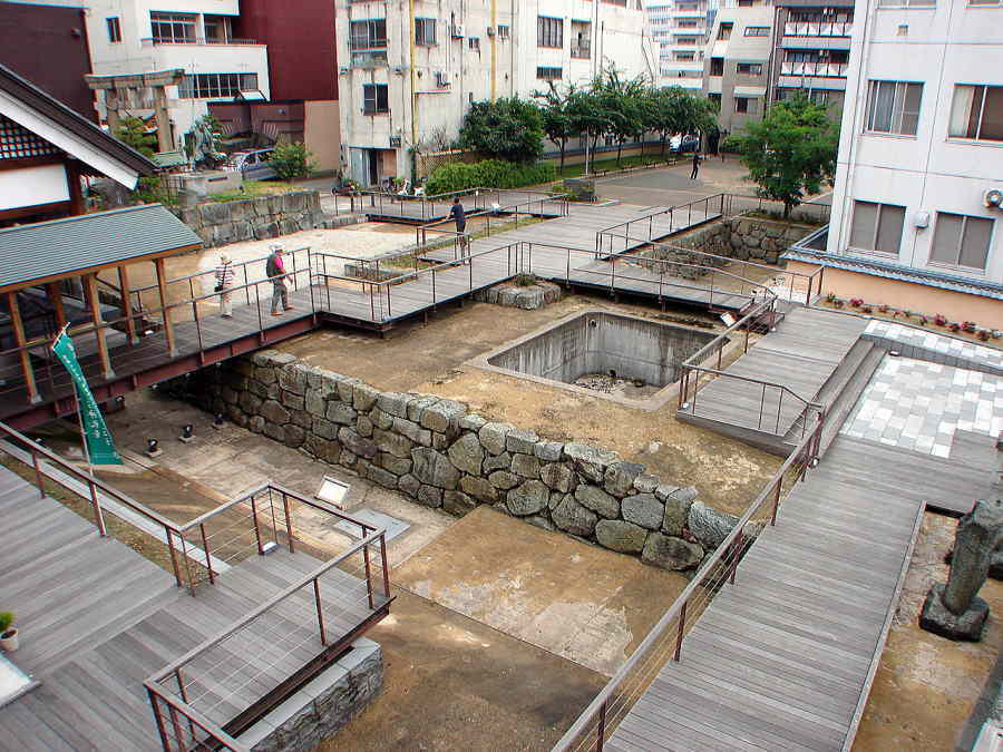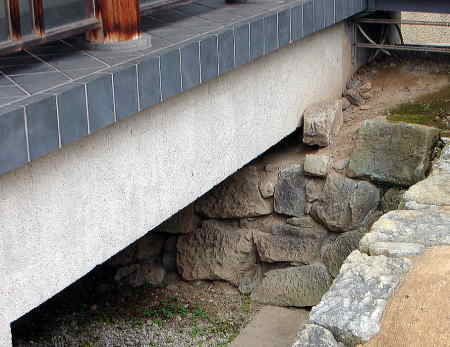 ![]() 拝殿下の石垣〜この石垣は、発掘調査で出土した状態のまま展示されている。当時は、今の石垣よりさらに数段高く積まれていた。 |