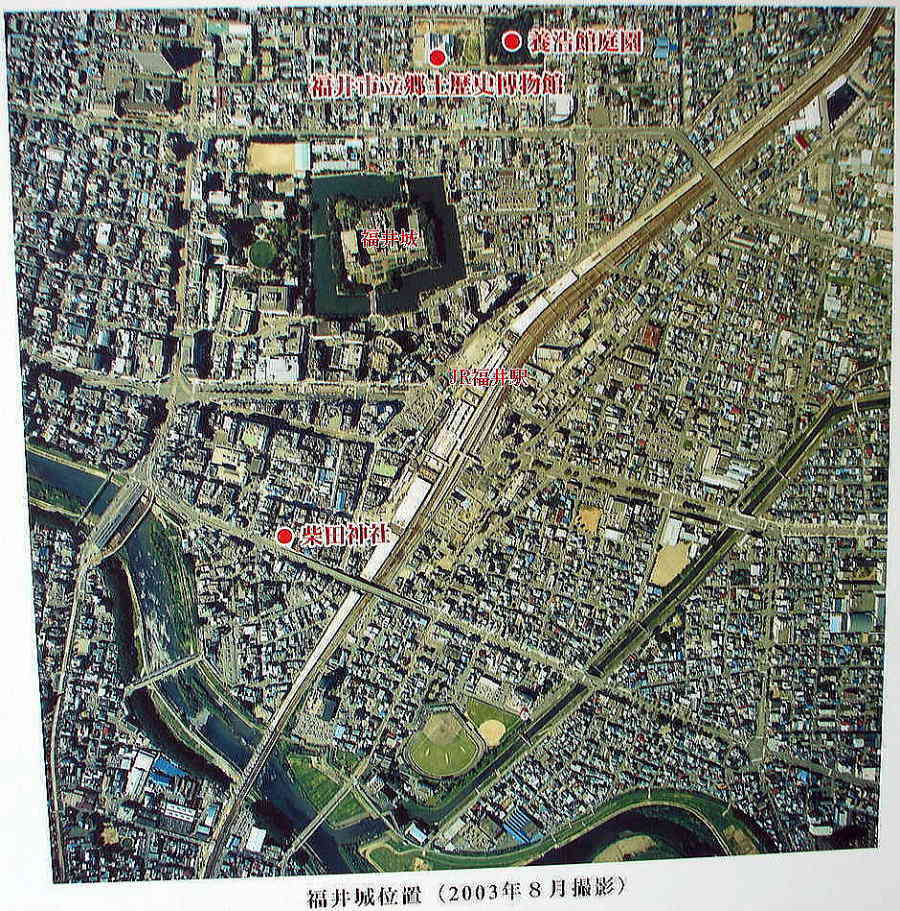 ![]() ▲上空から見た北ノ庄城と福井城の位置関係。JR福井駅から北ノ庄城址まで徒歩5分(写真は、休憩棟・展示資料館にて撮影) |